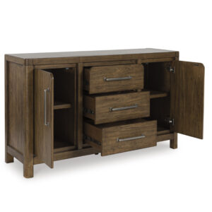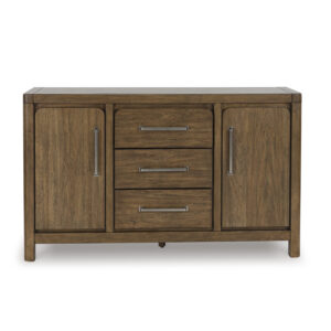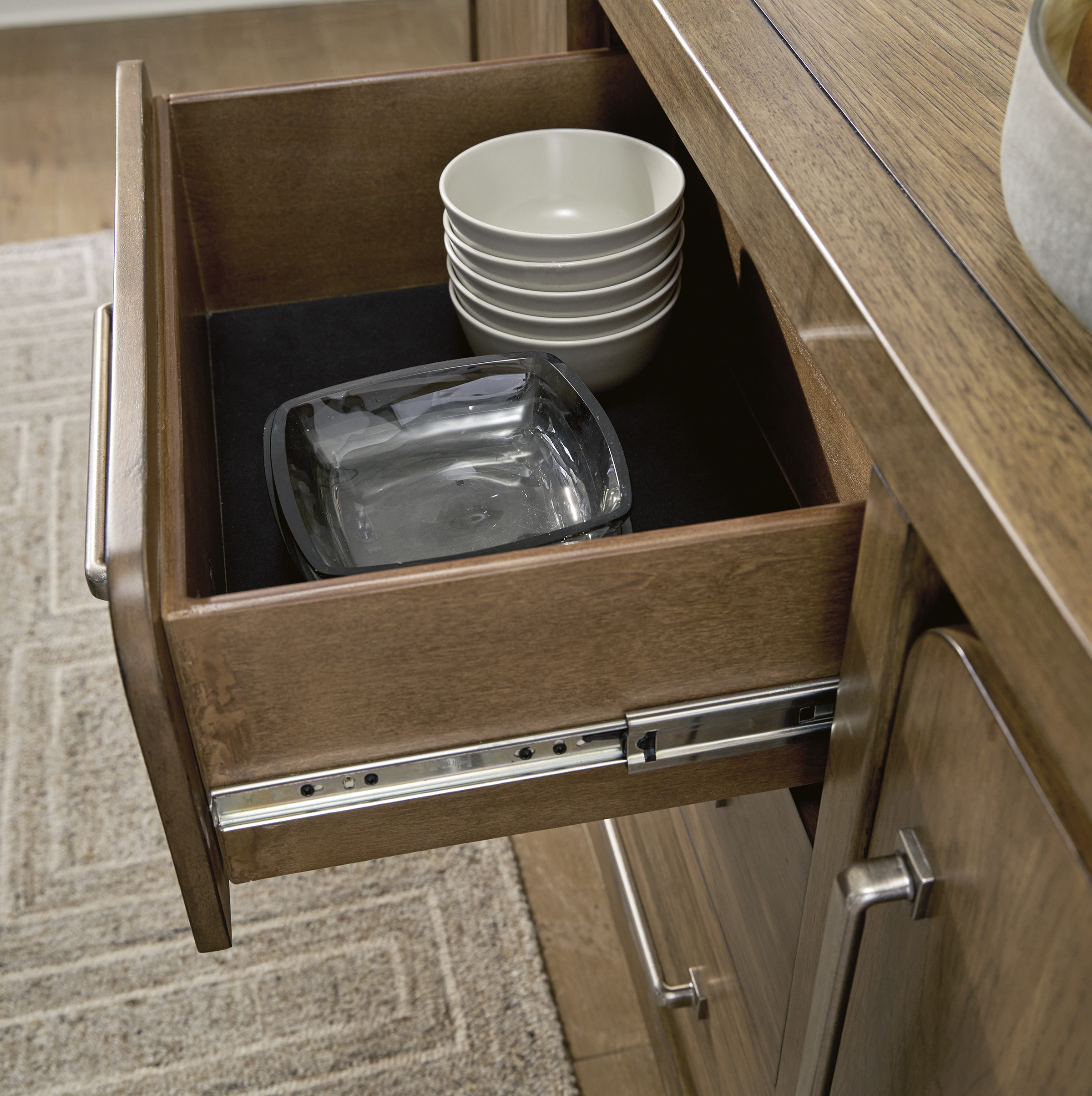 Define your dining room with reliable function and style. The Cabalynn dining server sits comfortably at the intersection of modern lodge and farmhouse aesthetics. Charming architectural elements and a light brown glazed finish reflect your warm and welcoming disposition. Even with its poise, it remains practical, serving up plenty of storage space in its dual cabinets and spacious drawers.