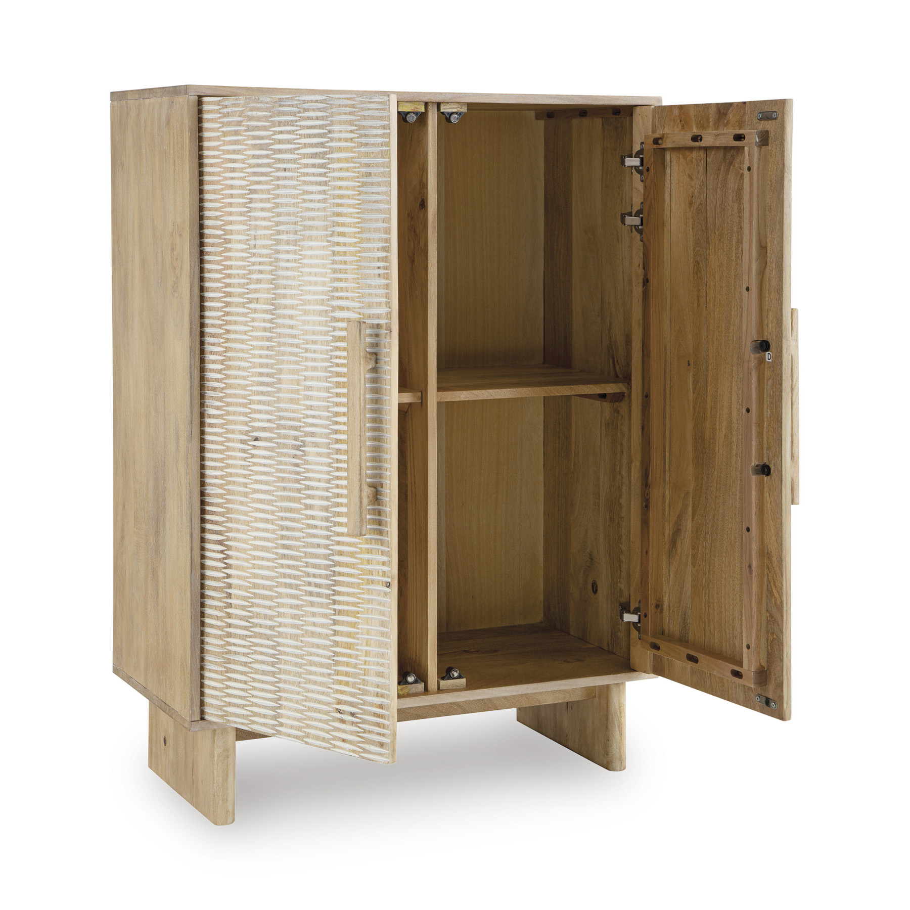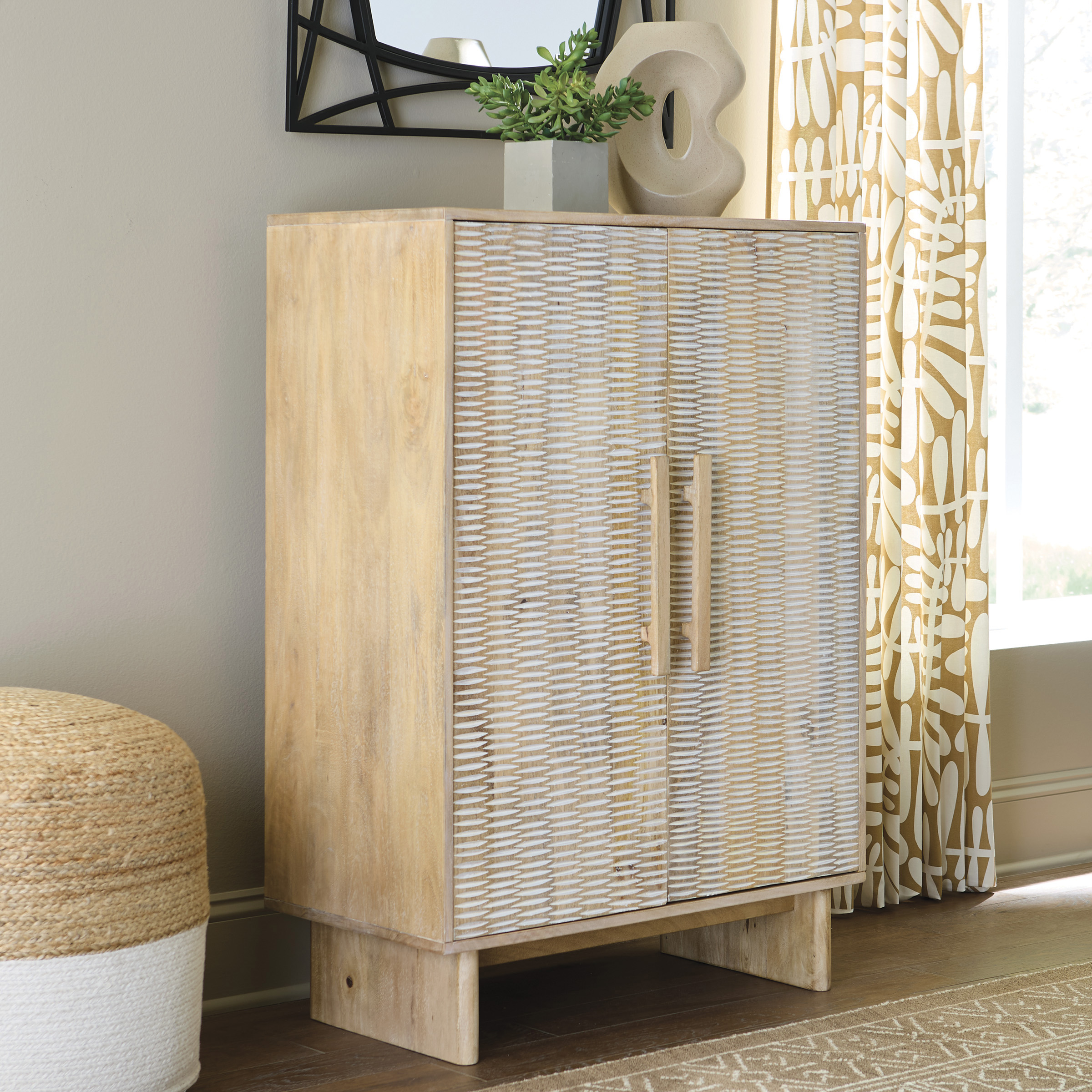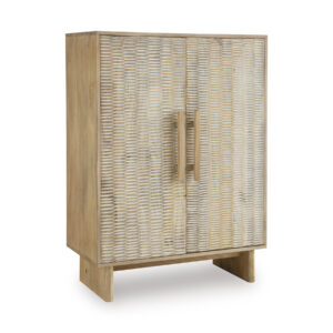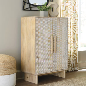 If it’s coastal chic or cottage quaint style you long for, the delightful Dallinbury accent cabinet is sure to satisfy. Doors with a carved scoop design in a whitewash and natural finish convey an easy-breezy sensibility, perfect for a relaxed vibe. A light wire-brushed effect enhances the wood grain. Two shelves cater to your out-of-sight storage needs. What a charming complement to your casual-chic decor.