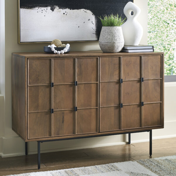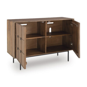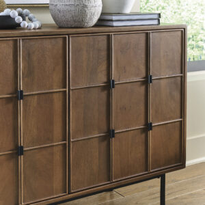 A step above the rest, the Juddins accent cabinet is so alluring and versatile. Push magnet doors with a captivating carved grid design open to reveal two interior shelves, keeping you organized in the most casually cool way.