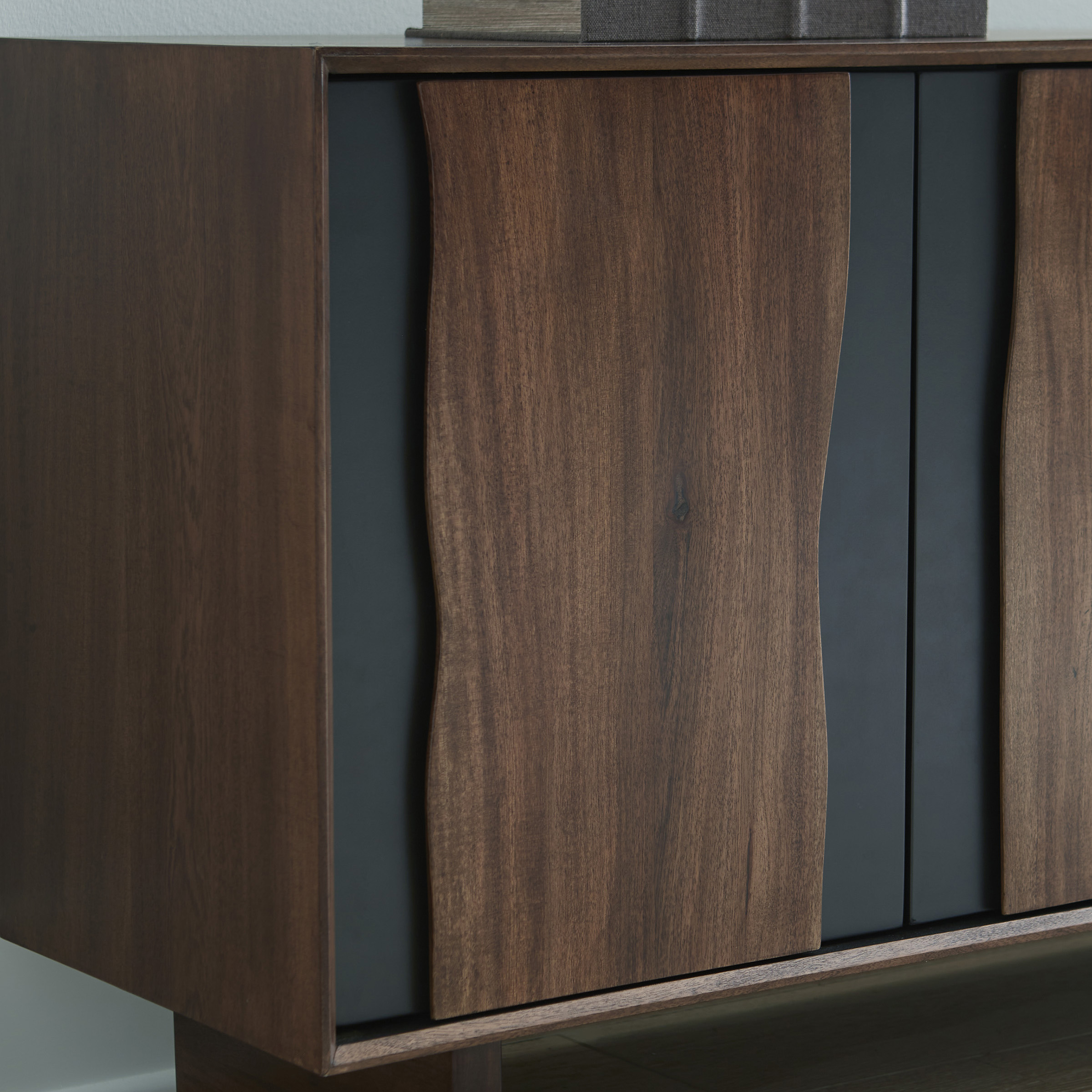 - Medium brown and charcoal gray finishes