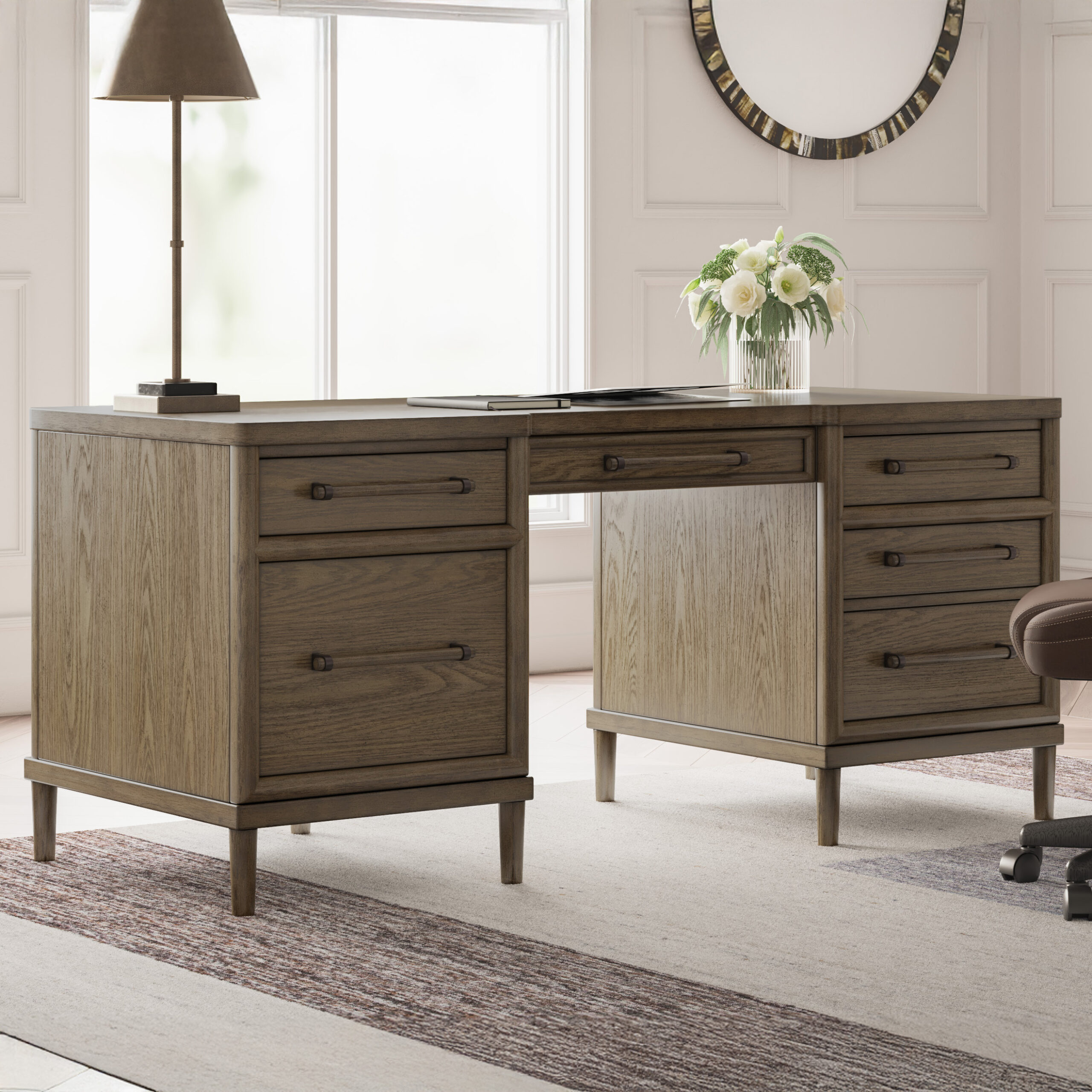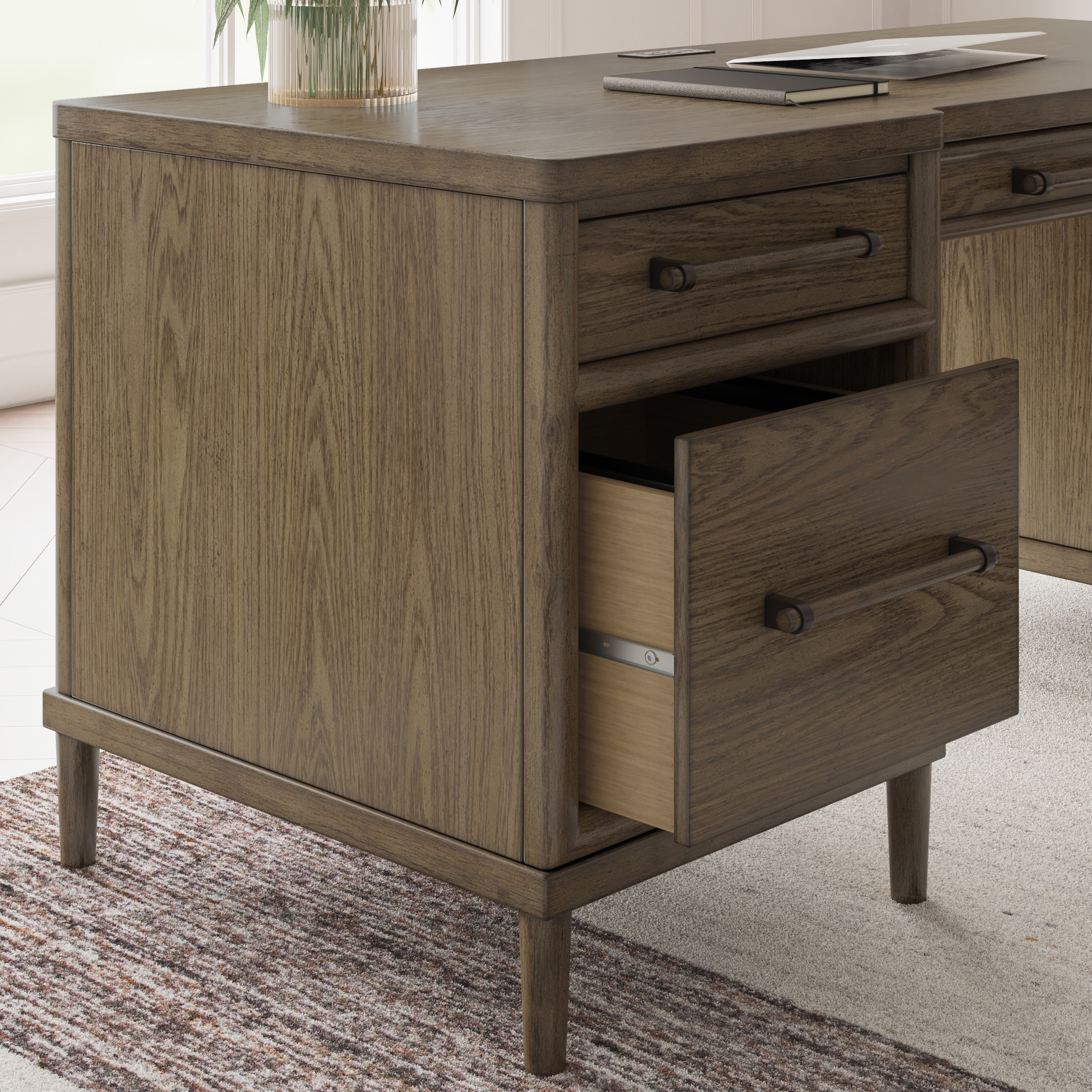 Give your mid-century modern decor that finishing touch with the Roanhowe home office desk. Spacious drawers with unique wooden drawer pulls enhance the design with stunning style. This desk takes minimalism to the max.