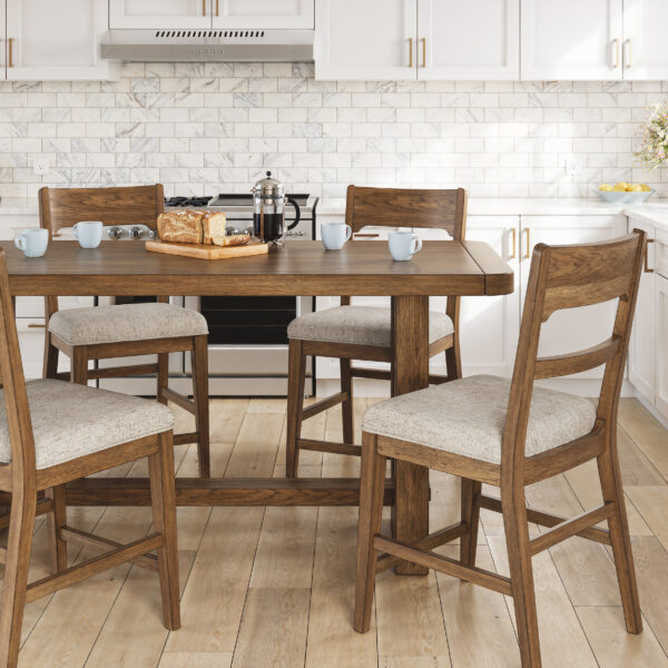 The Cabalynn counter height bar stool sits comfortably at the intersection of modern lodge and farmhouse aesthetics. Your warm and welcoming disposition is reflected in the charming architectural elements and neutral textural fabric. Even with its poise, the stool remains practical. Its cushioned seat invites you to linger longer at the table, defining your dining room with reliable function and style.