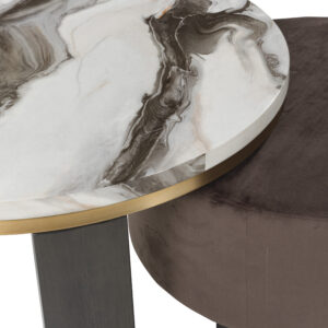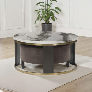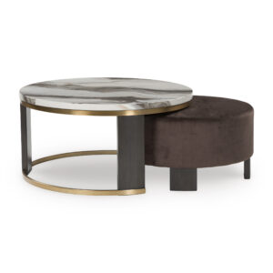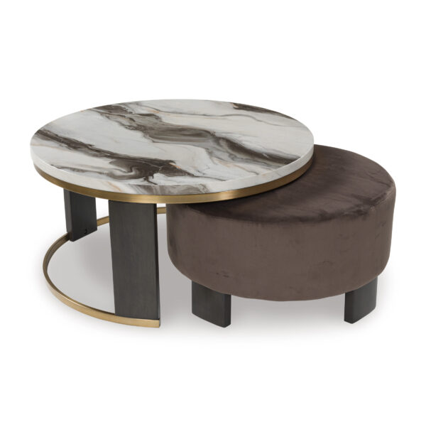 Ultra-contemporary design, everyday convenience. The trend-forward Jazmore nesting coffee table completes your confidently curated living room with its marble-patterned top and eye-catching brass-tone frame. Dark wood grain on the legs provides a beautiful contrast. Paired with a nesting ottoman in chocolate brown velvet upholstery, this piece serves up must-have function in sophisticated style.