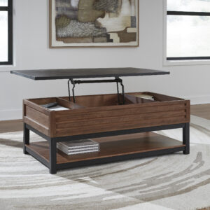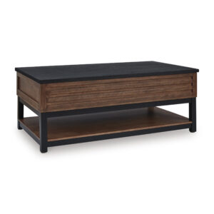 Double down on casual chic with the two-tone look of the Kallari lift-top coffee table. Its warm brown and matte black finishes reflect your eye for modern design. The trend-right slatted styling brings added charm. And with a handy lift top, working from home or catching up on a show with dinner is a breeze.