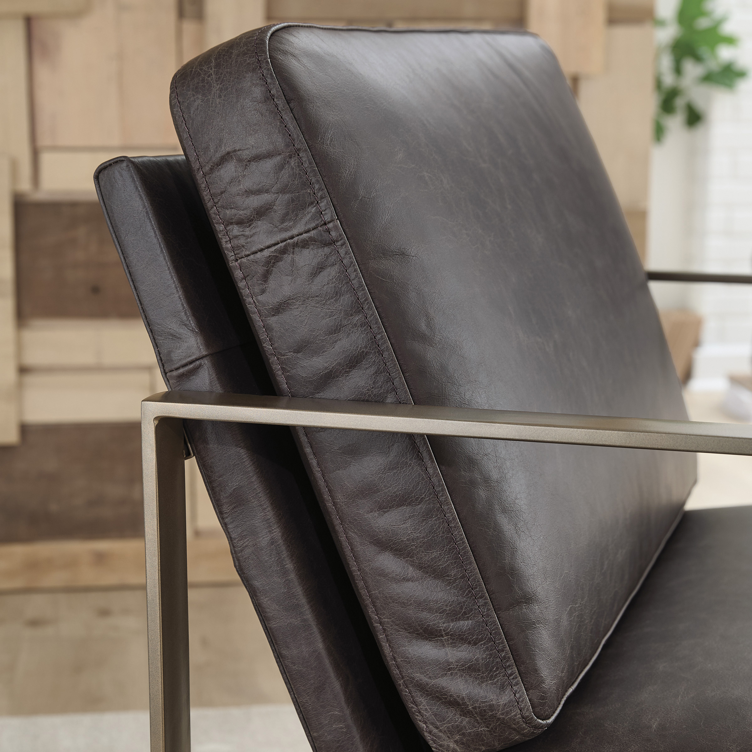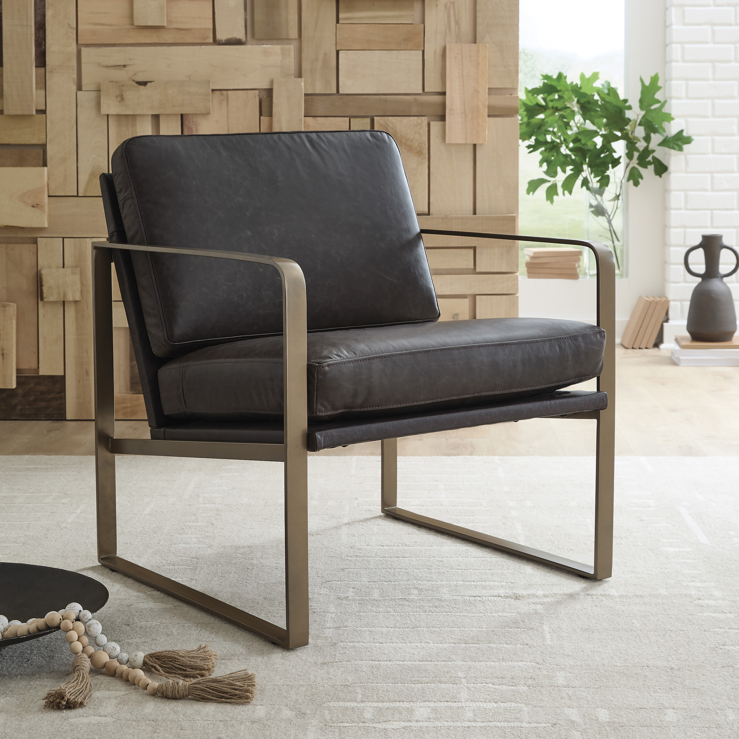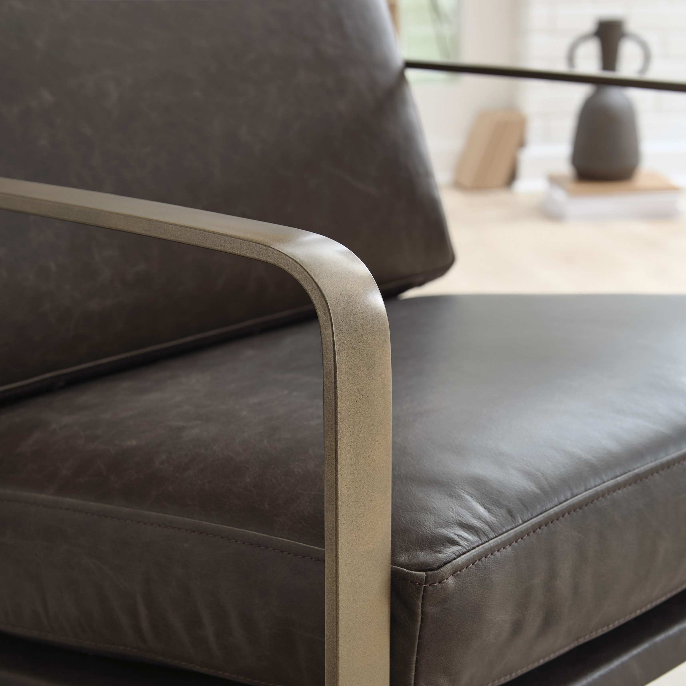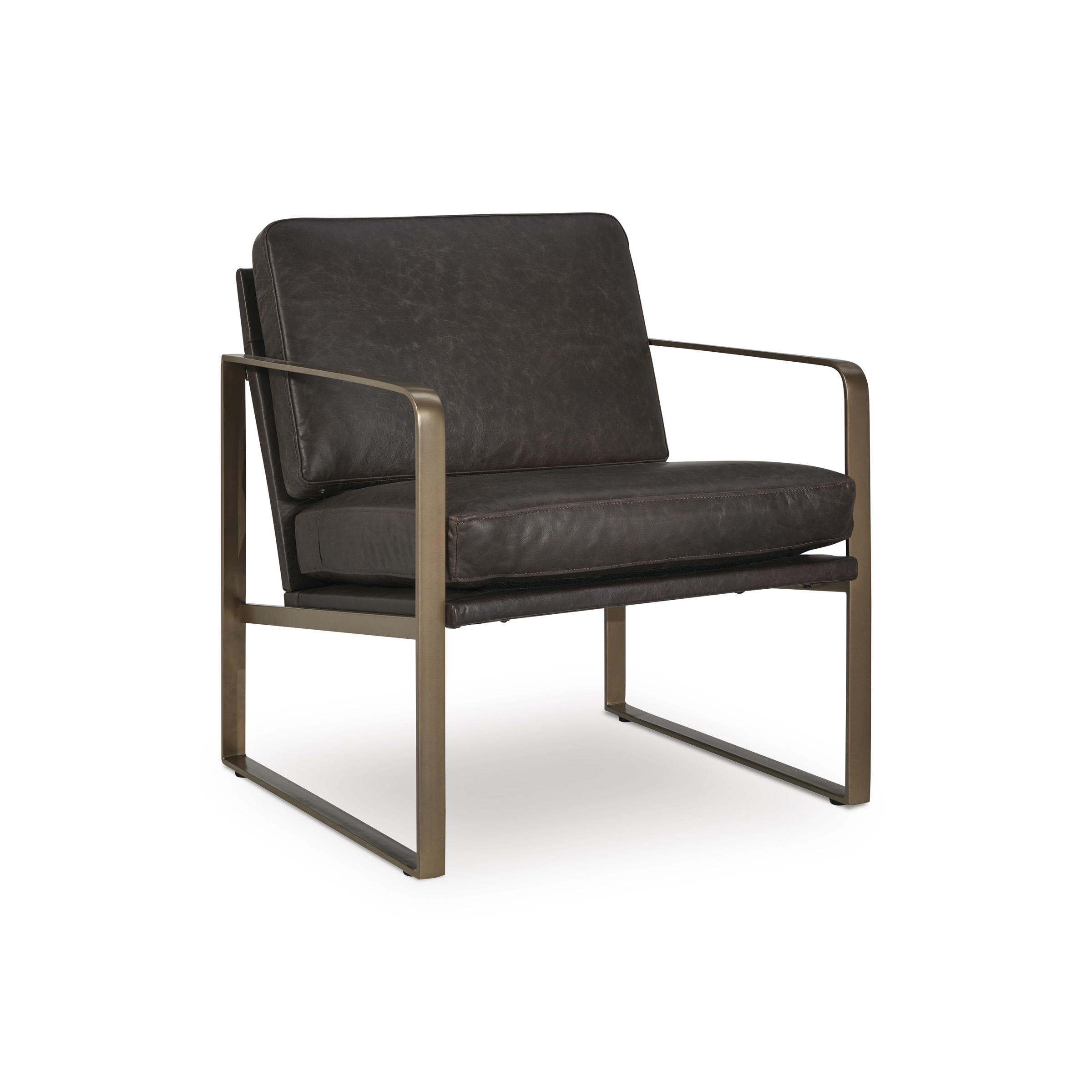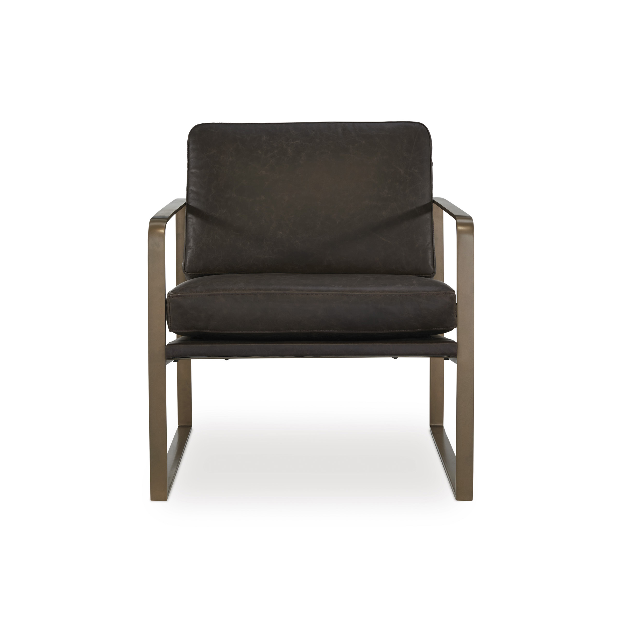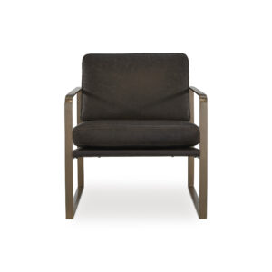 Wowing with supple dark brown leather and a metal frame in a soft goldtone, the Bradett accent chair brings an element of modern sophistication. An ultra-cool base gives so much urban industrial appeal.