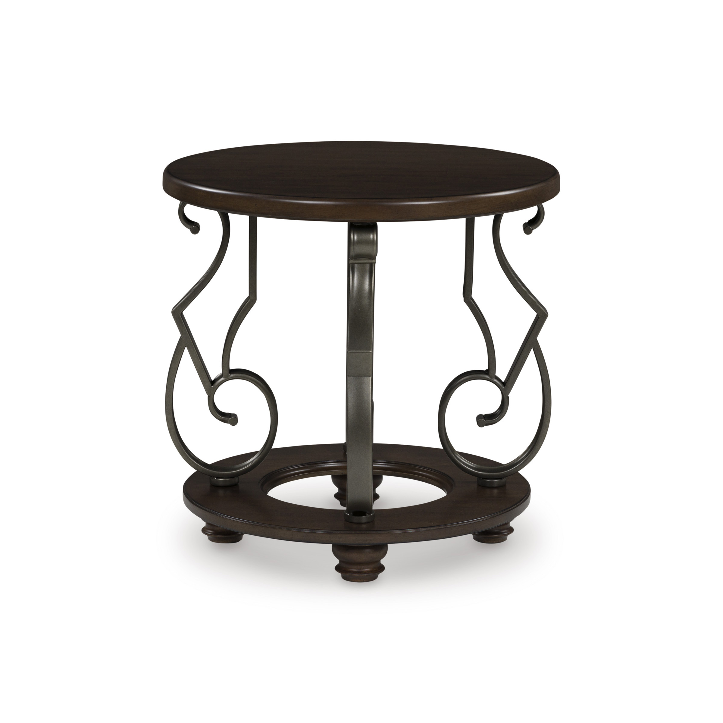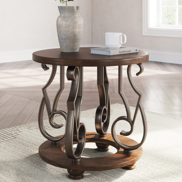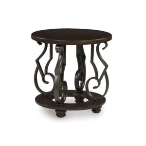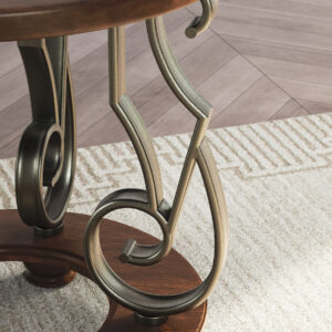 The Frallyn end table is nothing short of stunning. A rich, warm brown finish exudes opulent elegance, while ornate metal legs add a touch of timeless sophistication. It’s perfect for displaying your delicious decor in grand style.