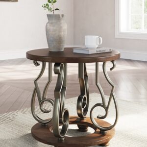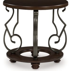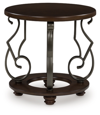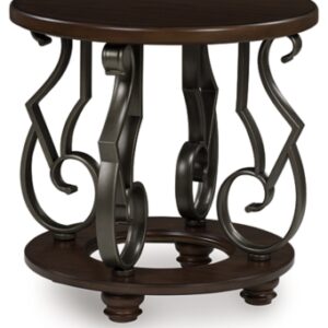 The Frallyn end table is nothing short of stunning. A rich, warm brown finish exudes opulent elegance, while ornate metal legs add a touch of timeless sophistication. It’s perfect for displaying your delicious decor in grand style.