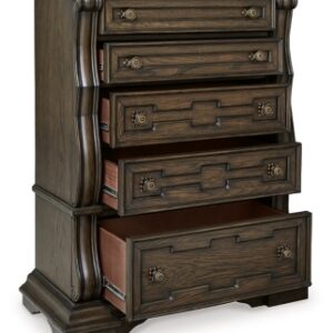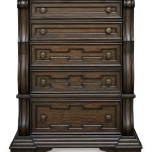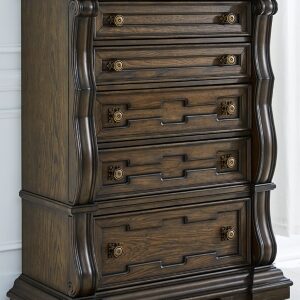 From its ornamental appliques to its large scale, the Maylee chest of drawers makes a bold statement. Spacious drawers store your clothes and more in stunning style. The look is timeless. The feel? Right at home.
