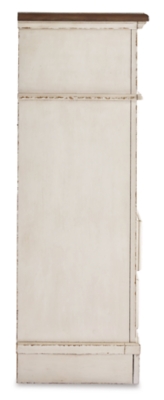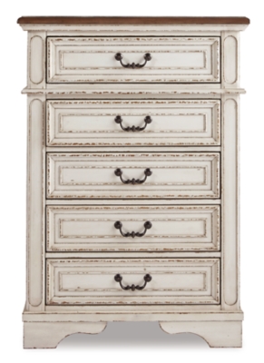 Elevating the art of traditional cottage styling, the Realyn chest of drawers is your dream bedroom retreat realized. Antiqued two-tone aesthetic blends a chipped white with a distressed wood finished top for added charm. Framed drawer fronts and decorative corbels add refinement, while bail pulls in a dark bronze-tone finish lend a classic touch.